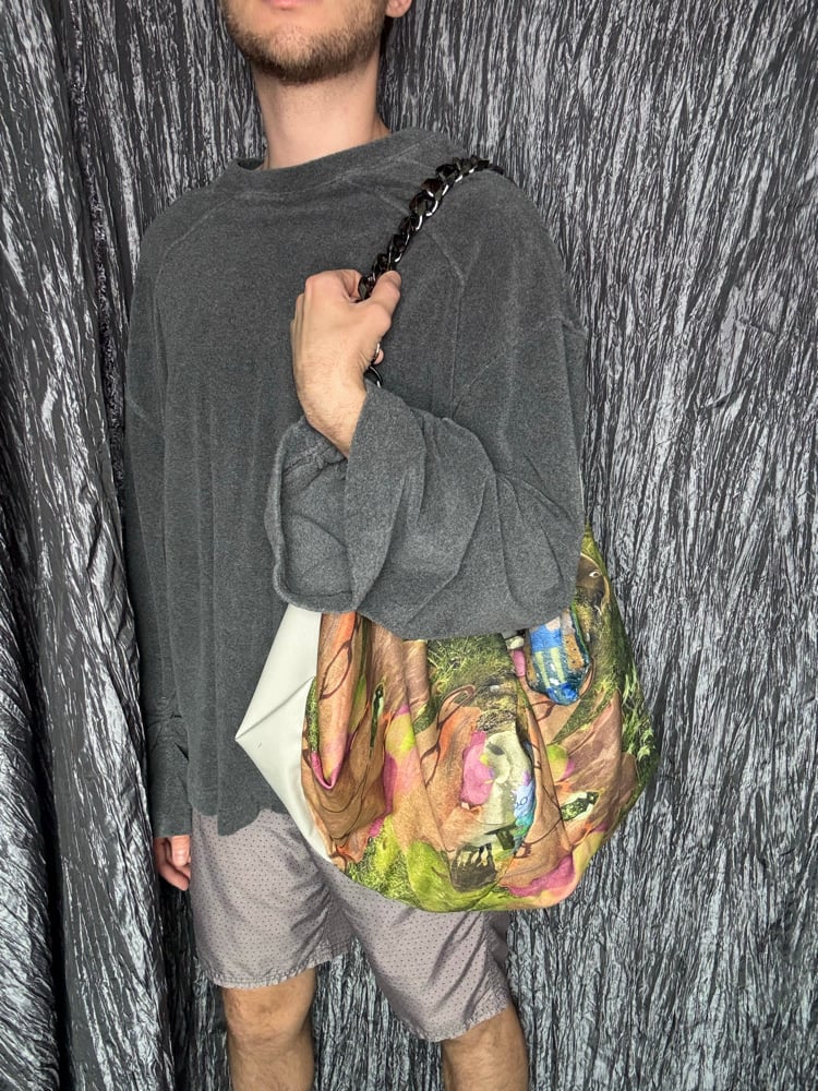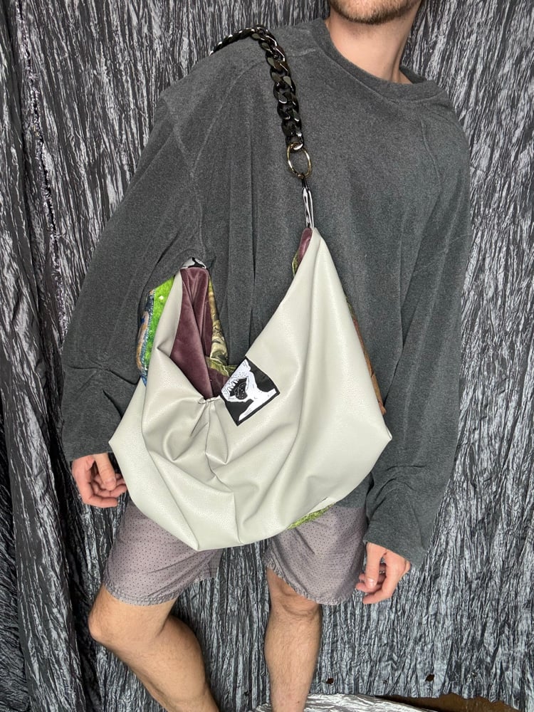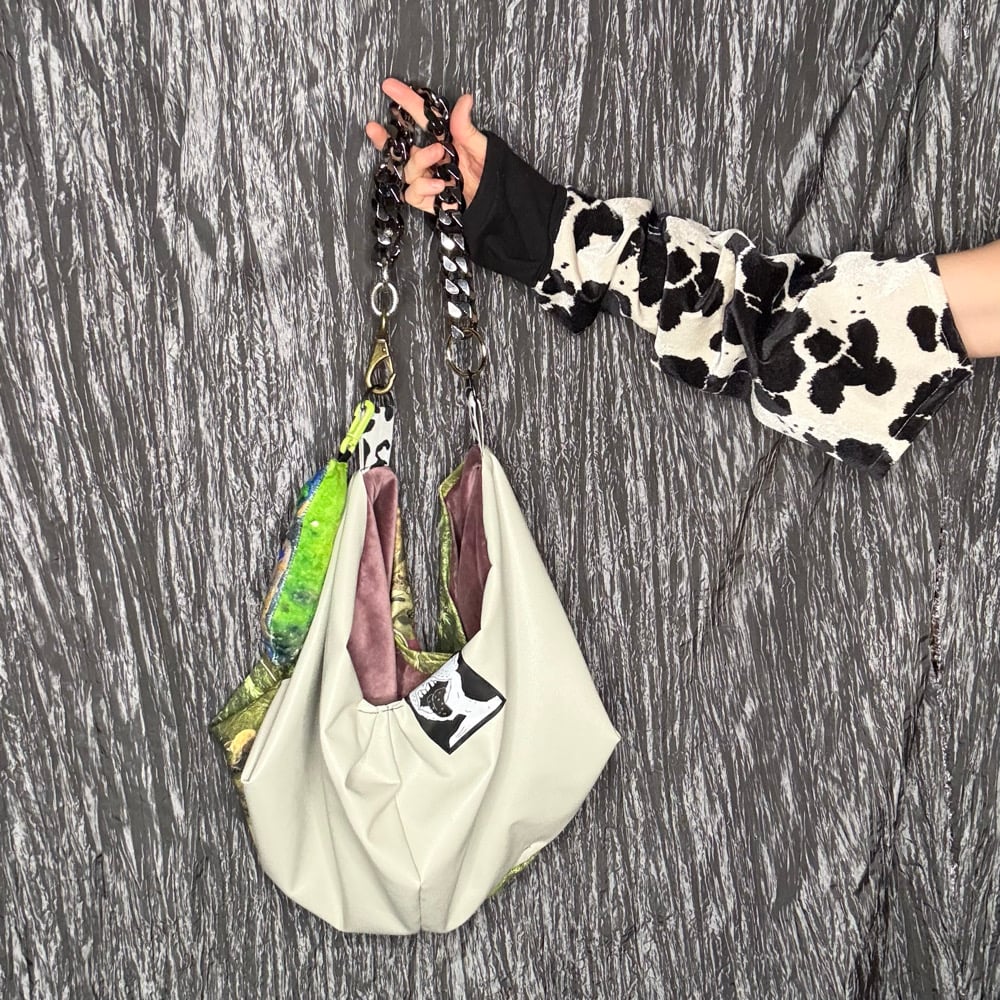 From the Lactose Intoler-Art jumbo bag prototype series. These bags are 1 of 1 and were used as samples during the process of creating a new bag shape. Each piece is unique with minor stitches and small imperfections that add character to these unique one-offs.