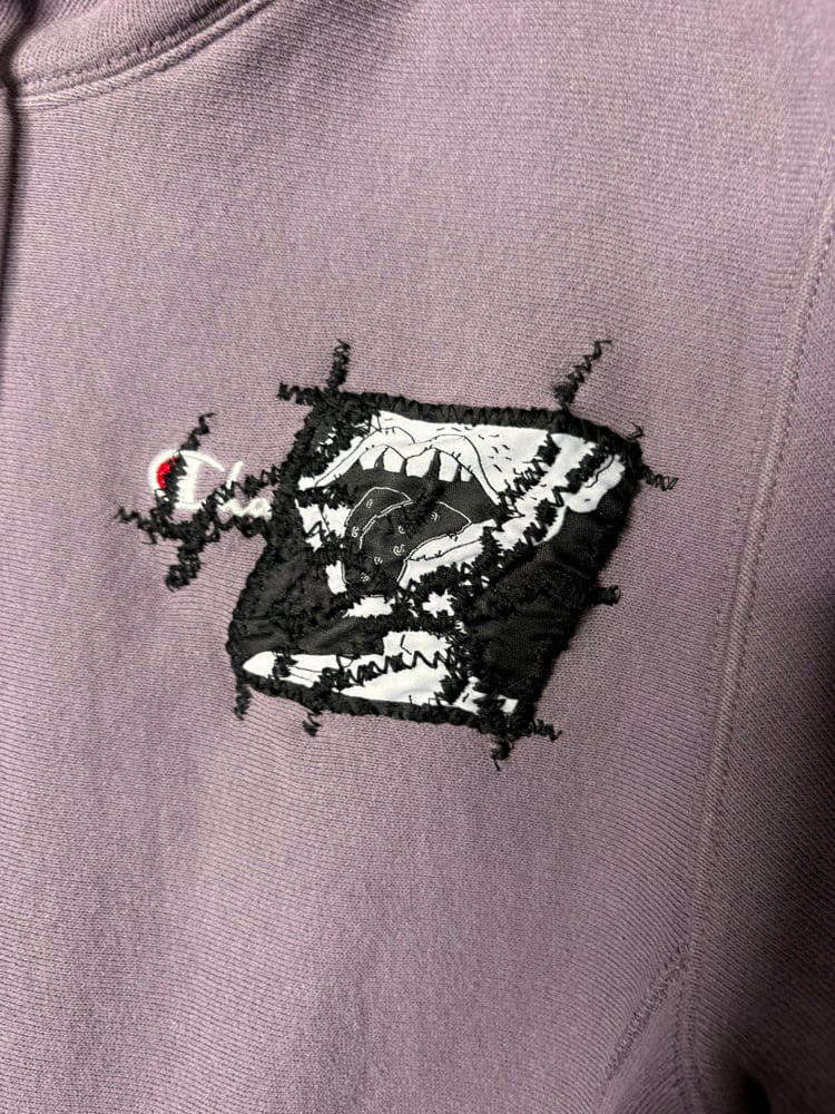 This one-off piece is remade from a found, second-hand champion hoodie.